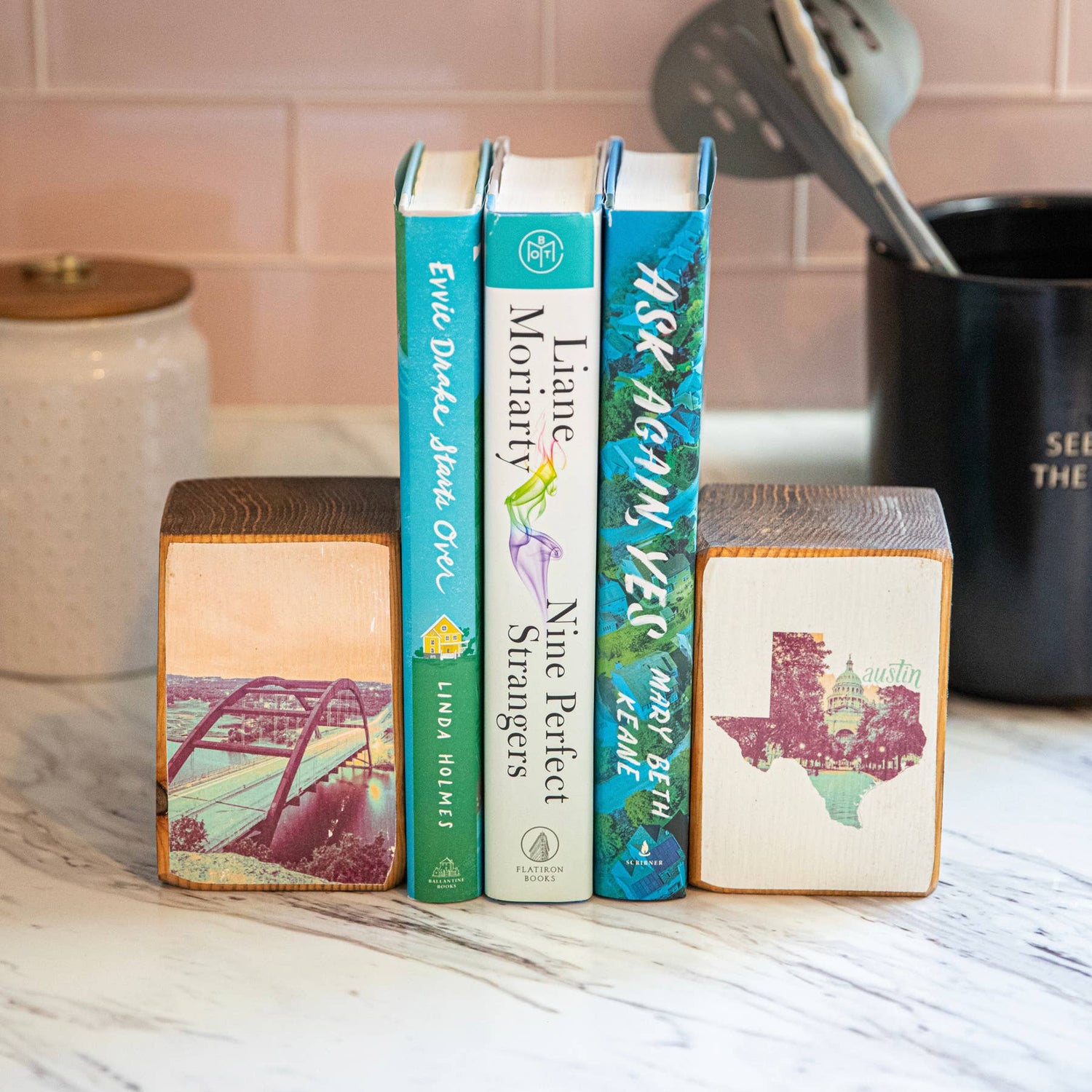 Perfect for your Air BnB! Bookend set includes two wood blocks, each sized: 3.5” wide x 5” tall x 3.5” deep (each weigh a little over 1 lb.) Image transferred by hand to wood. Due to the handmade nature of our art, all images will have a distressed look (where the underlying white paint shows through the image), with slight variations on the amount and location of distressing.