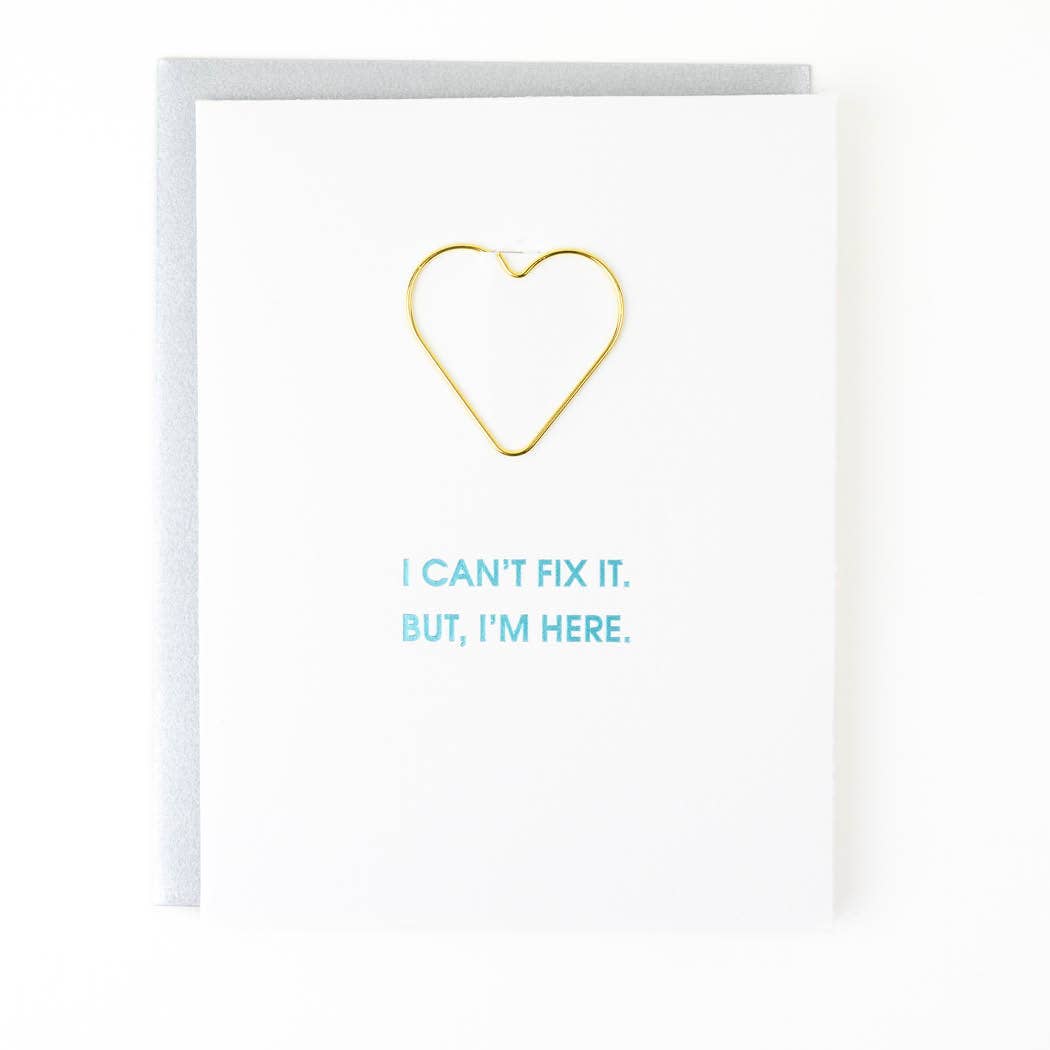 Our "I Can't Fix It But I'm Here" encouragement card is letterpress printed on a vintage printing press. Card includes a heavy duty heart-shaped paper clip.
