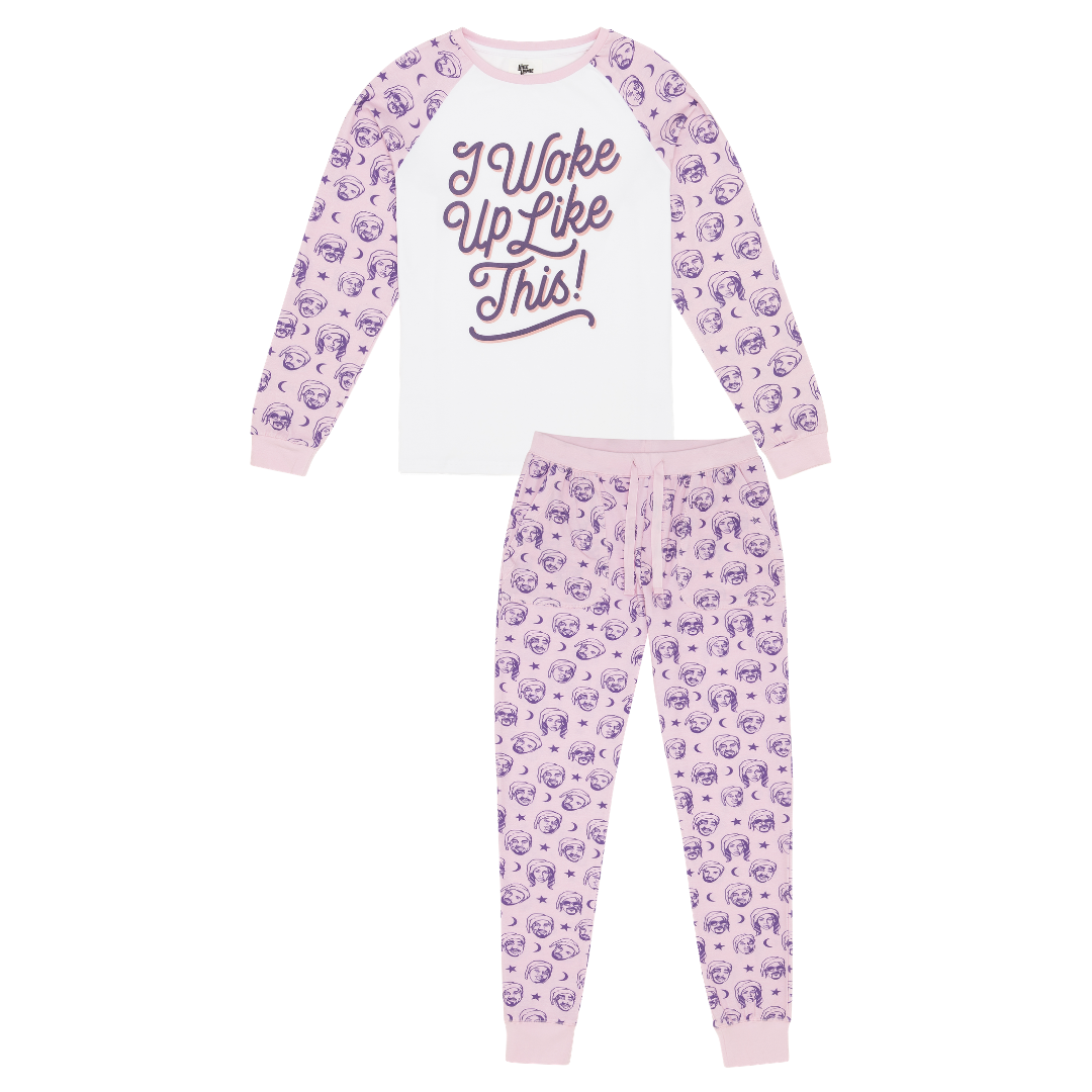 The Mama set features the slogan 'I Woke Up Like This' alongside a hip-hop inspired print on both the top & drawstring pants.