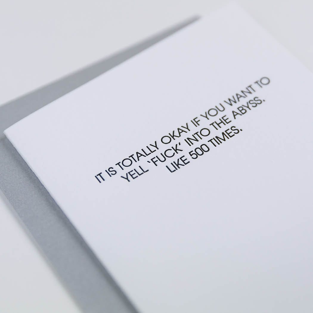Our "It is Totally Okay if You want to Yell 'Fuck' Into the Abyss. Like 500 Times" Encouragement card is letterpress printed on a vintage printing press.