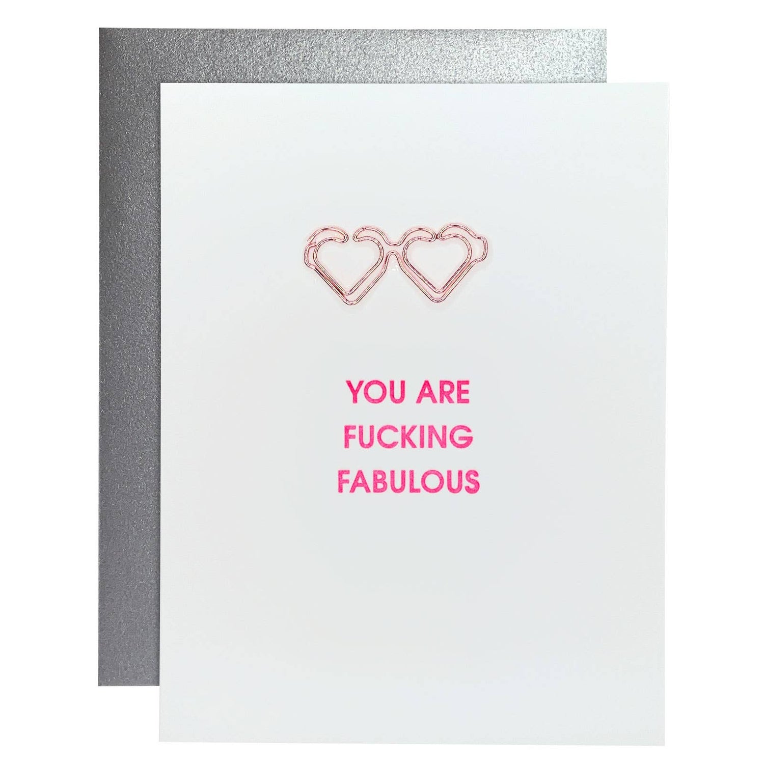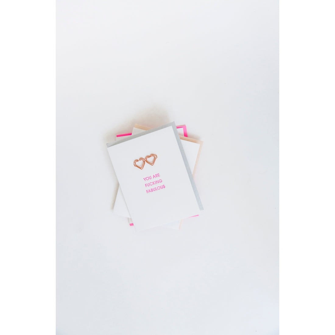 Our Fucking Fabulous card is letterpress printed on a vintage printing press. Card includes a heavy duty heart-shaped sunnies paper clip.
