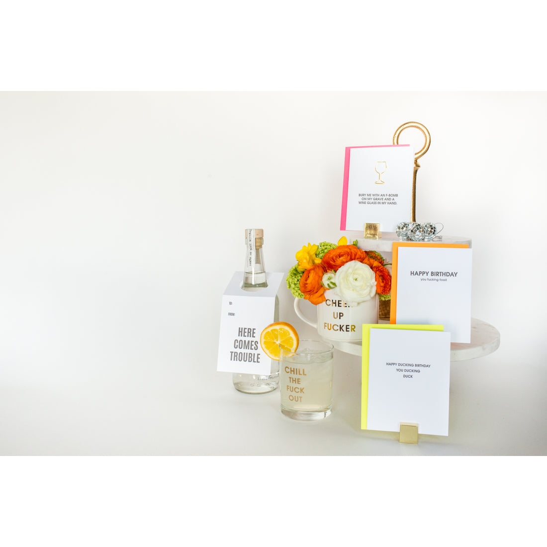 At Chez Gagné, we believe if you can't make it nice, make it funny. We've been strategically placing f-bombs since 2014. Loved by millennials and their parents, Chez Gagné has morphed from a funny greeting card company into a modern lifestyle gift brand. When Alex Gagné Glover founded the brand in 2014, Chez Gagné was strictly a letterpress greeting card and wine tag line. Today, our Los Angeles based company sells hilarious yet inspirational gold foil mugs, wine + rocks glasses, candles, wine & spirit tags, cocktail paper clips and obviously cards.