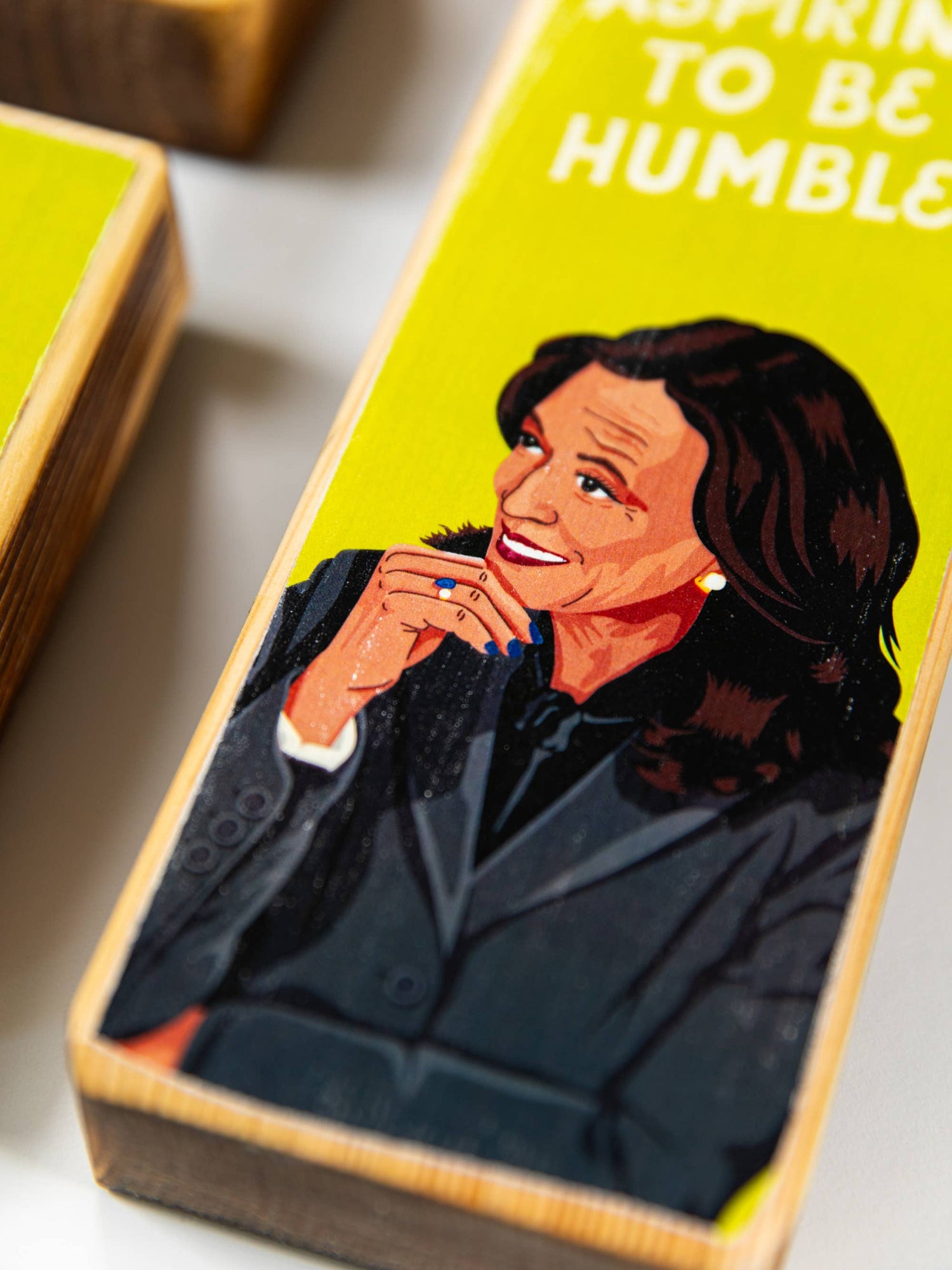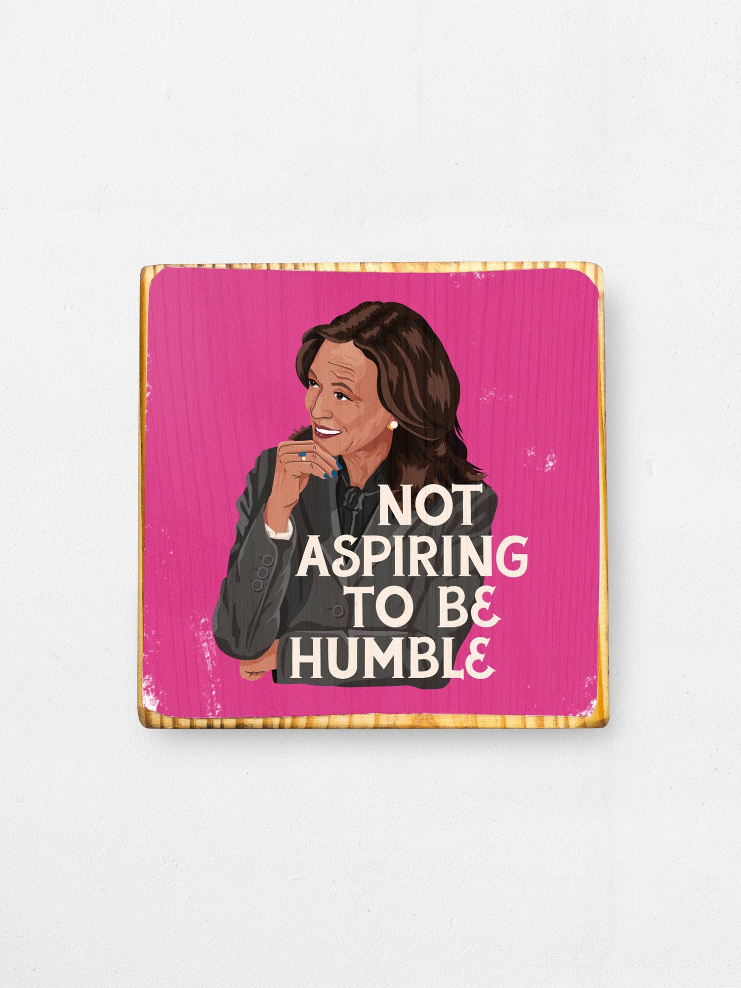 Wood art featuring original illustration of Kamala Harris (inspired by her facial expressions during the Presidential debate) with the hand lettered quote, "Not aspiring to be humble," inspired by her chat with Alex Cooper on the Call Her Daddy Podcast.