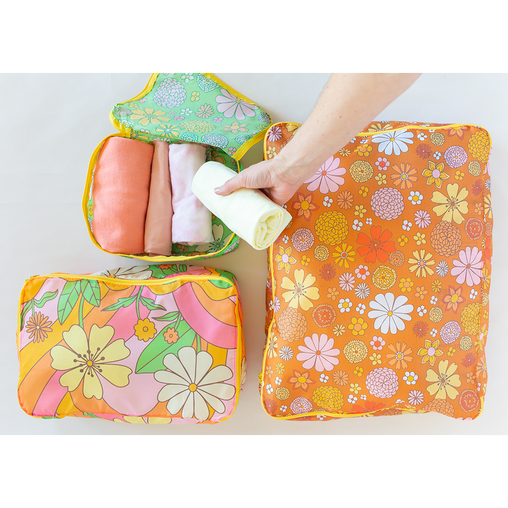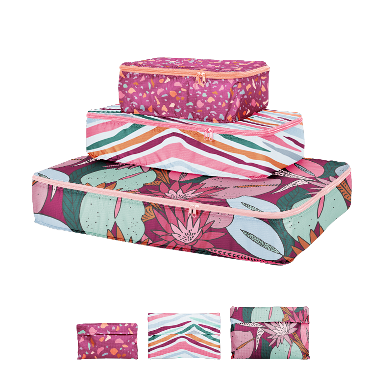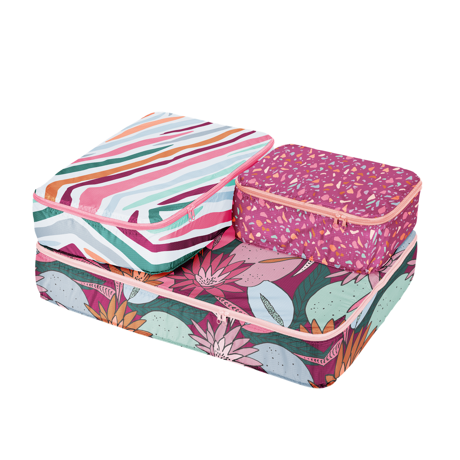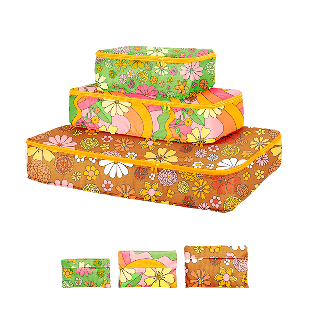 Is it time for a trip? If you're into organization even a tiny bit then we know you don't even think about packing without your handy dandy packing cubes. These sets come in three different sizes, each with a carefully selected coordinating pattern. The packing cubes themselves fold up into attached pouches and come in a reusable drawstring pouch for quick and easy storage. You have everything to gain and only disorganization to lose, what are you waiting for?