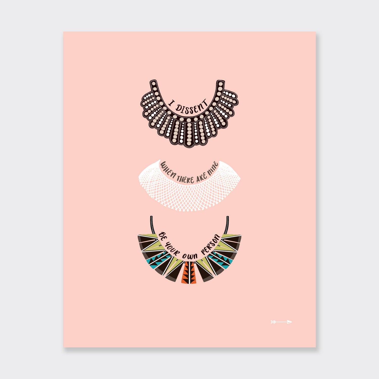 Art print features an original illustration of three of RBG's most popular dissent collars on a light pink background with three of her sayings: