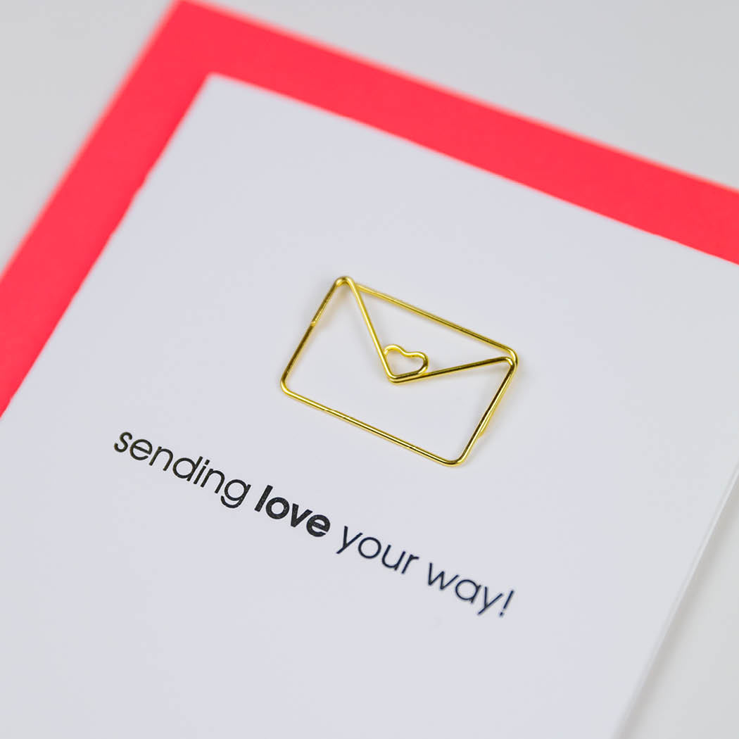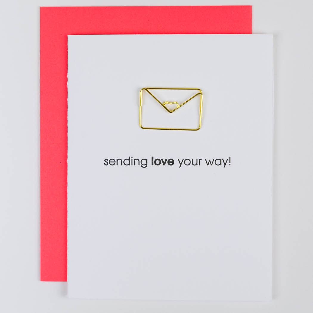 Our Sending Love Your Way card is letterpress printed on a vintage printing press. Card includes a heavy duty envelope-shaped paper clip.