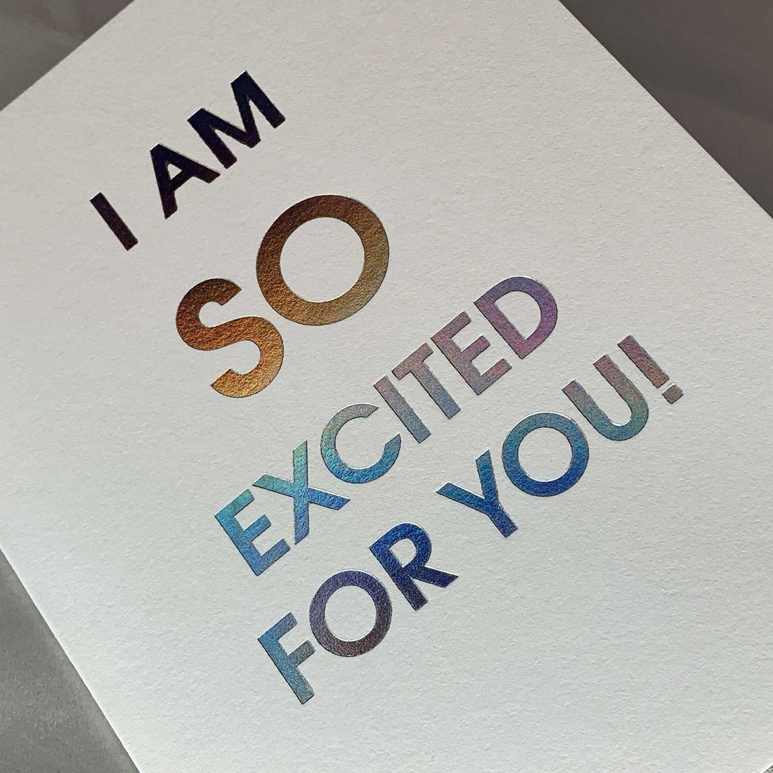Our So Excited For You card is letterpress printed on a vintage printing press.