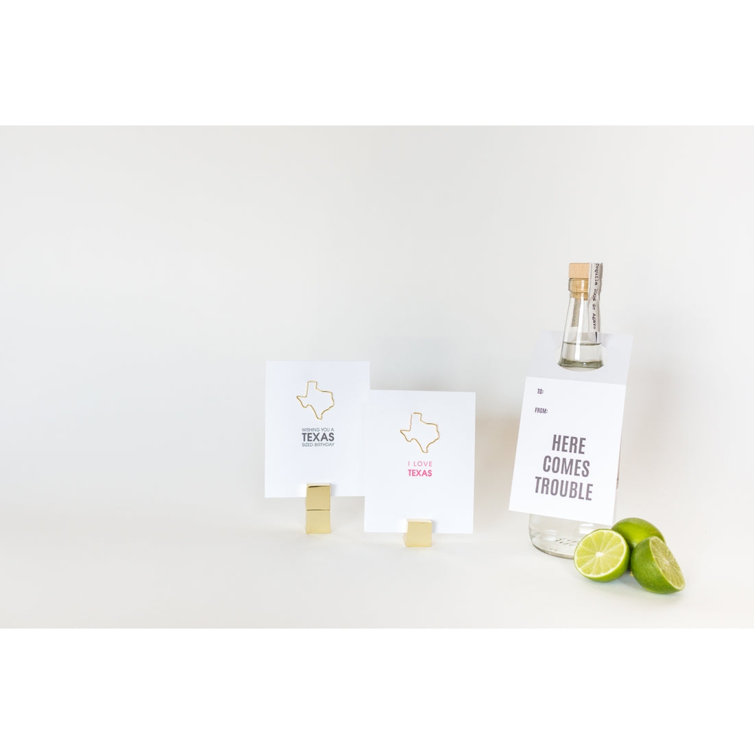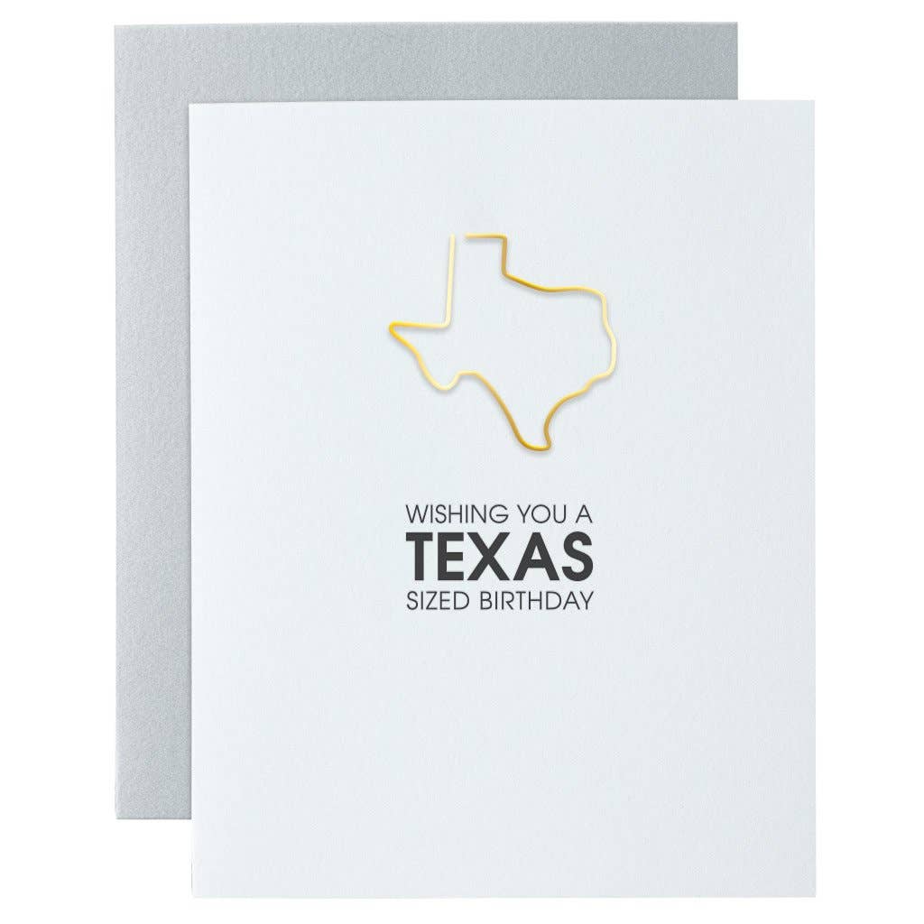 Our "Wishing You a Texas Sized Birthday" card is letterpress printed on a vintage printing press. Card includes a heavy duty gold Texas paper clip.