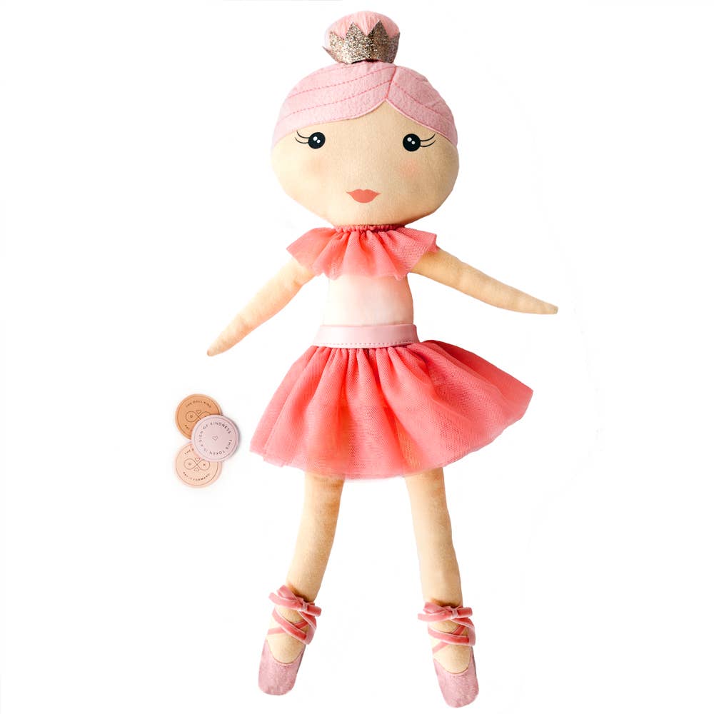 The Grace Doll features a light-pink hued top and a deep rose tutu skirt. She has a ballerina-inspired topknot made of the finest pale pink yarn and is topped with a glittered crown. She's finished with soft pink ballet slippers and a delicate printed face.