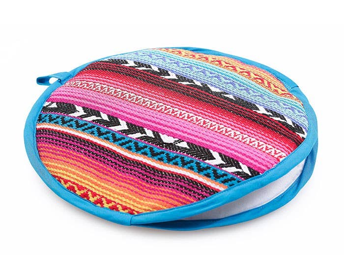 Heat and serve tortillas using the insulated Flat Tortilla Warmer in Blue! Made using woven yarn textile, this is a perfect fit for everyday dining needs. Used for bread, pita, naan keeps food warm for over an hour. Available in several colors & designs.